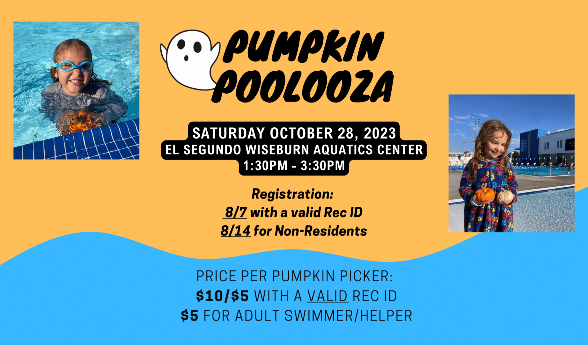 Take a plunge in our floating pumpkin patch! Our annual Pumpkin Pool-ooza will be on Saturday, October 28th from 1:30 p.m. - 3:30 p.m. at the Aquatics Center. Come for the pumpkin pickin', stay for the pumpkin decorating, games raffles, and frightening good time!
